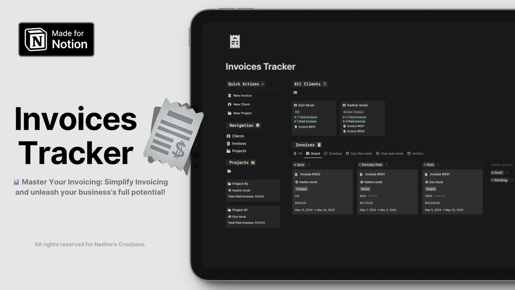 Streamline your business operations with ease using our meticulously designed Invoices Tracker Notion Template. Whether you're managing client projects, tracking payments, or analyzing business performance, this template offers: