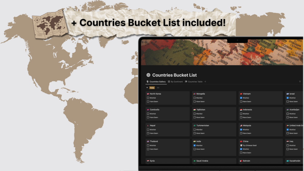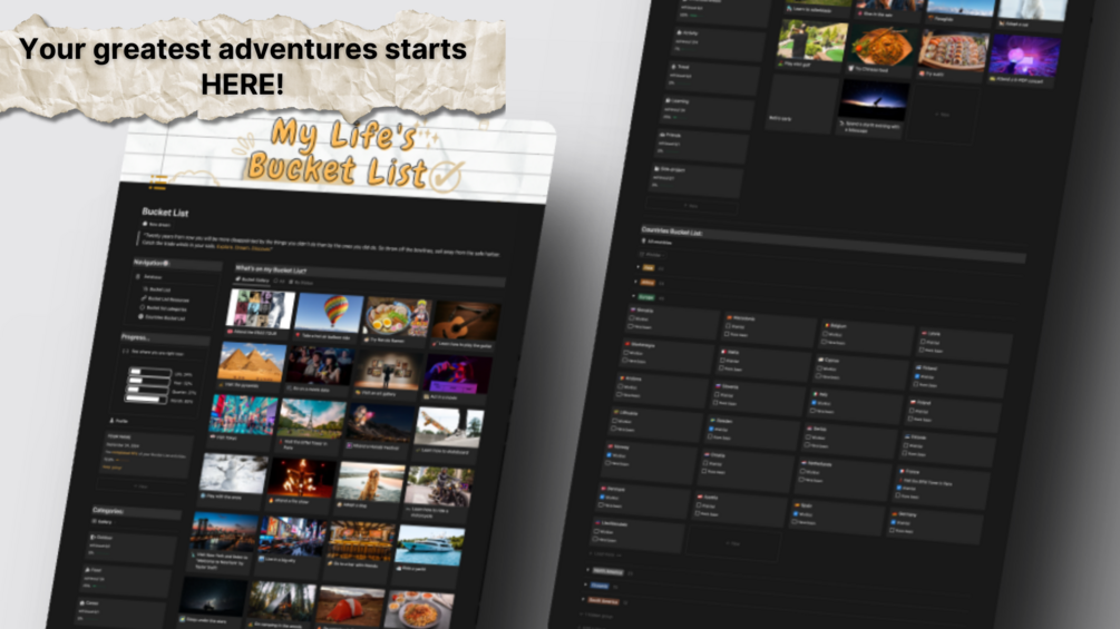 π Your Dream Life Awaits: Don't just dream itβlive it! Start your adventure today with our Ultimate Bucket List Notion Template. Whether you're a seasoned traveler or a budding explorer, this template is your ticket to a life filled with excitement, growth, and endless possibilities! π
